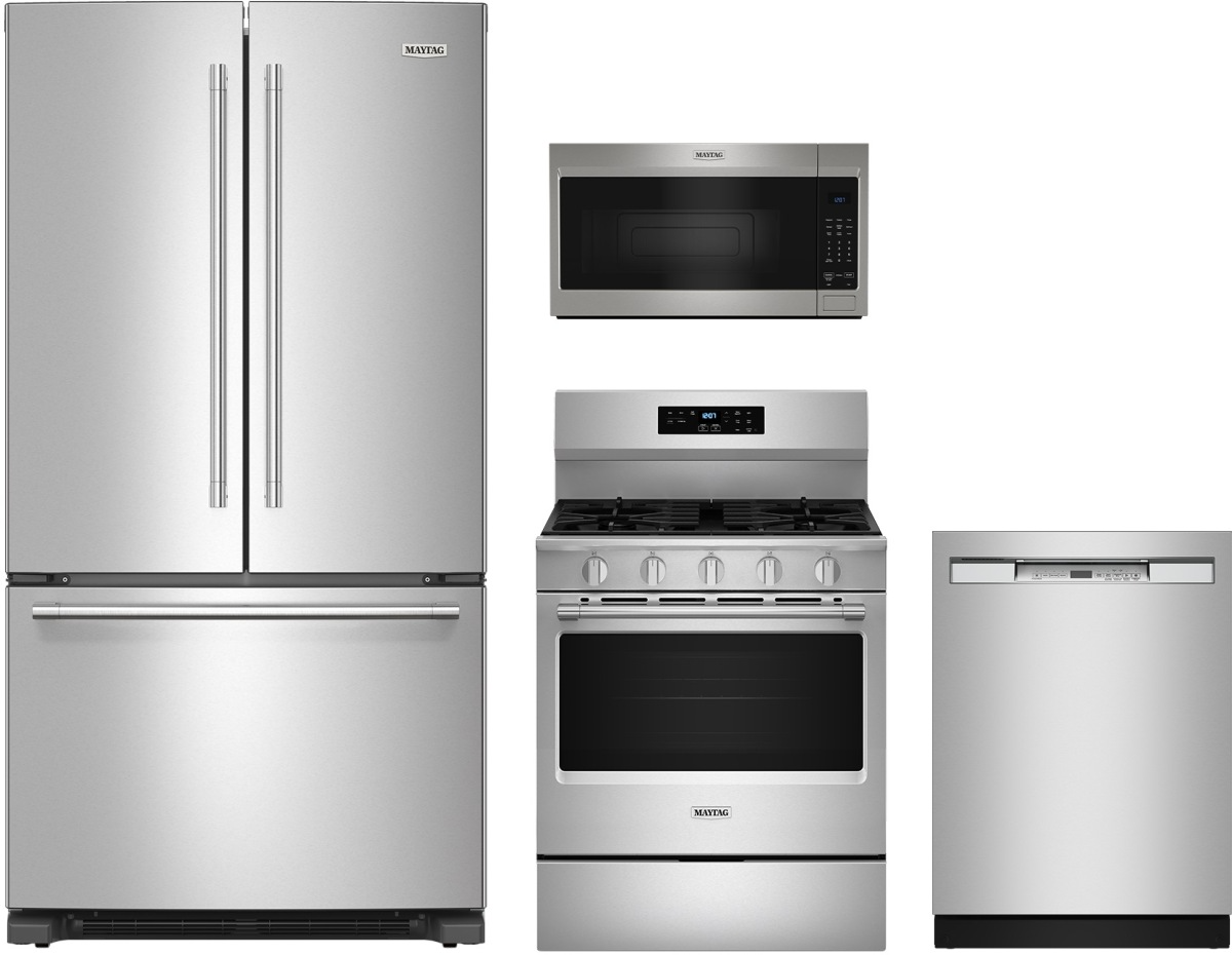 Maytag® 4 Piece Fingerprint Resistant Stainless Steel Kitchen Package with a French door refrigerator, built in dishwasher, freestanding gas range and over the range microwave.Read More