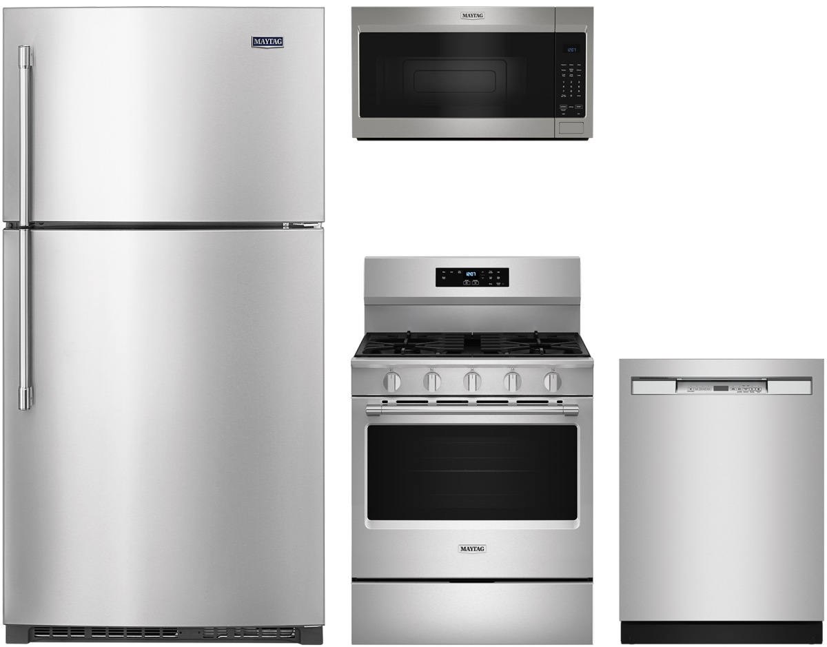 Maytag® 4 Piece Stainless Steel Kitchen Package with a top freezer refrigerator, built in dishwasher, freestanding gas range and over the range microwave.Read More